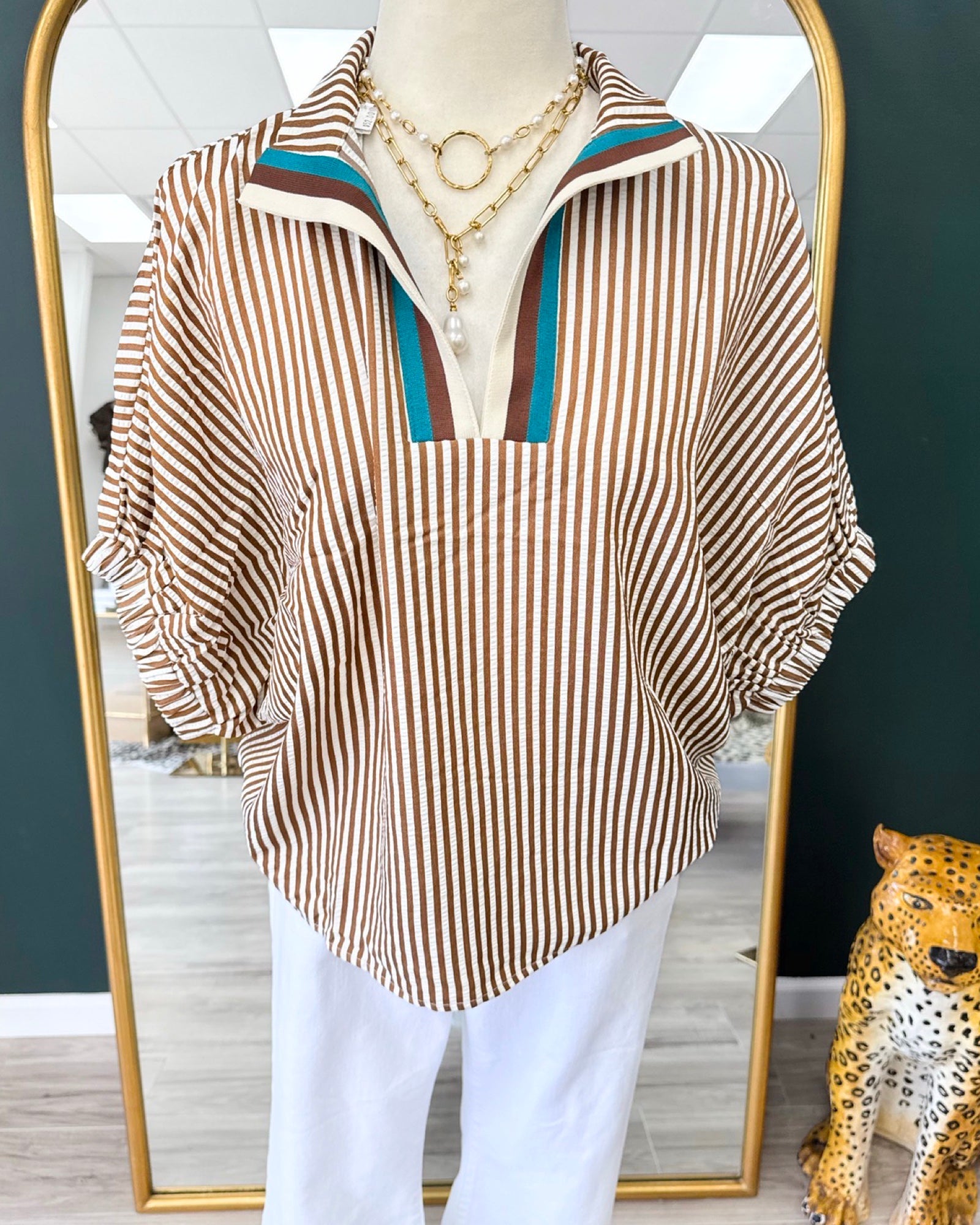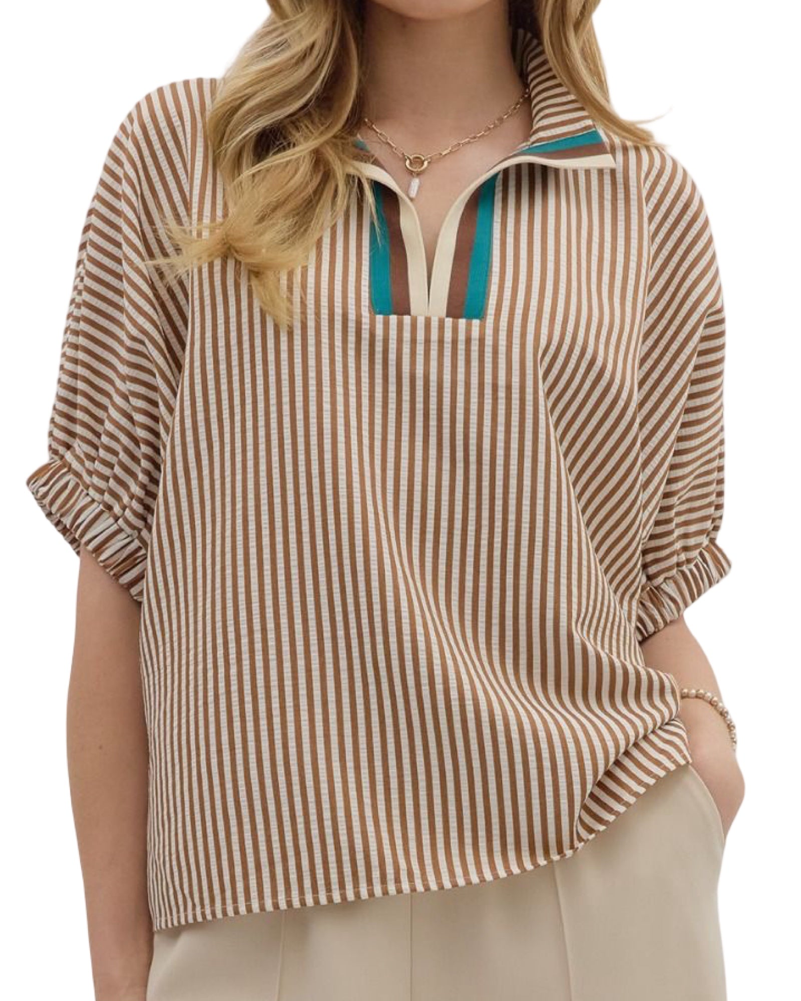 Add a splash of fun to your wardrobe with this Camel Stripe Elastic Band Top. Its cozy elastic band ensures a perfect fit while the playful camel stripes bring a cheerful vibe to any outfit. Perfect for casual days when you want to feel comfy and stylish all at once!