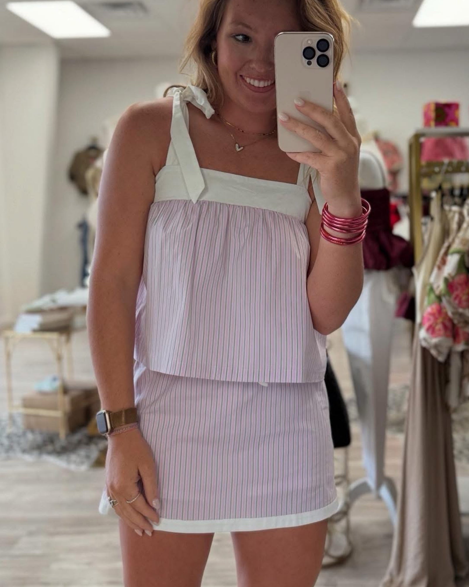 This stylish Pink Striped Tie Skirt Set is designed for ladies. The flattering fit and eye-catching design make it a versatile addition to any wardrobe. Crafted from high-quality materials, this set offers both comfort and style. Perfect for any occasion, it's a must-have for fashion-forward individuals.