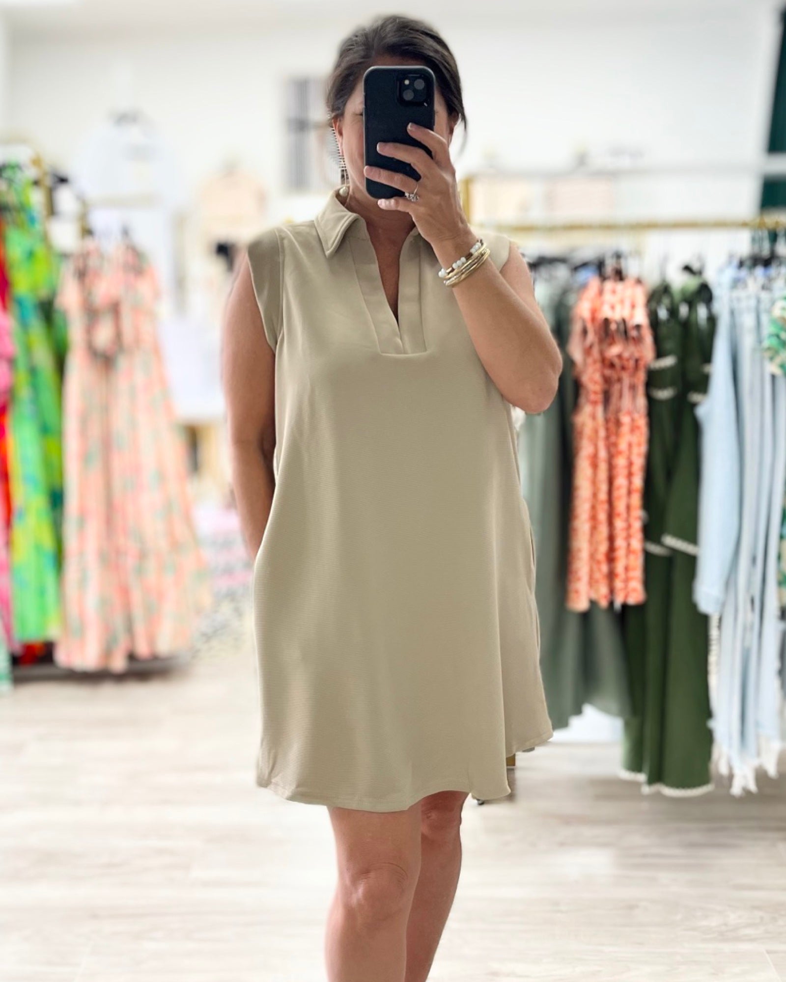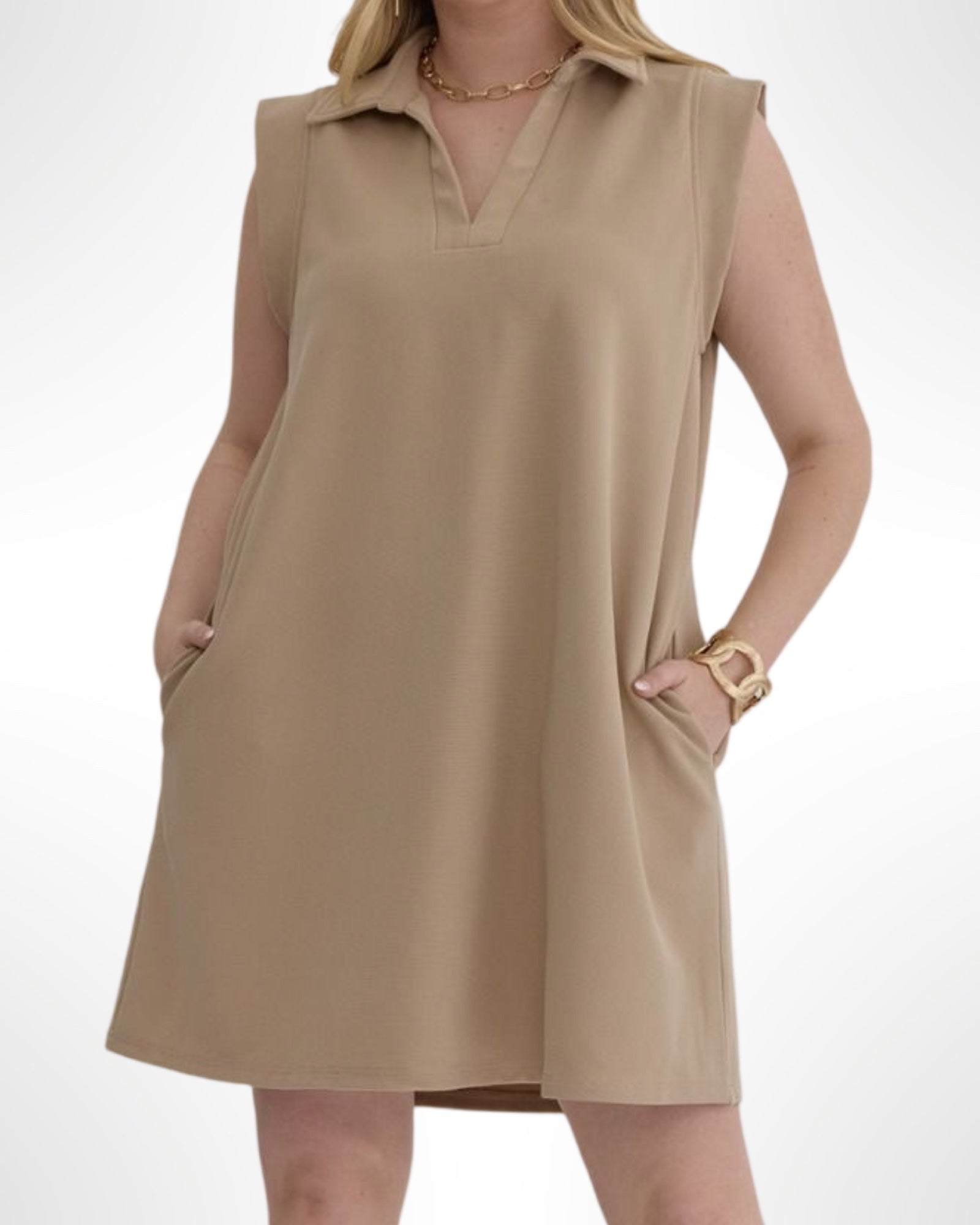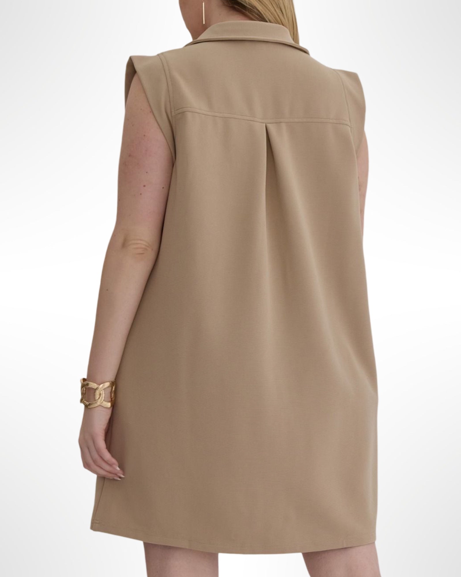 "Expertly crafted from high-quality taupe fabric, this collared sleeveless dress is perfect for any occasion. The plus size is designed to flatter your figure, providing both style and comfort. Add this versatile piece to your wardrobe for a timeless and elegant look."
