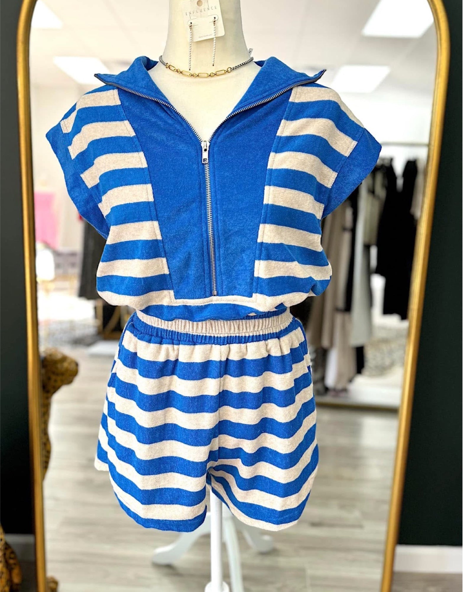 Jump into summer with this Cobalt Blue and Cream Stripe Short Romper! Perfect for a day at the pool or a beach getaway, this romper is designed for ladies who love to swim and have fun in the sun. Stay stylish and comfortable with this playful piece.