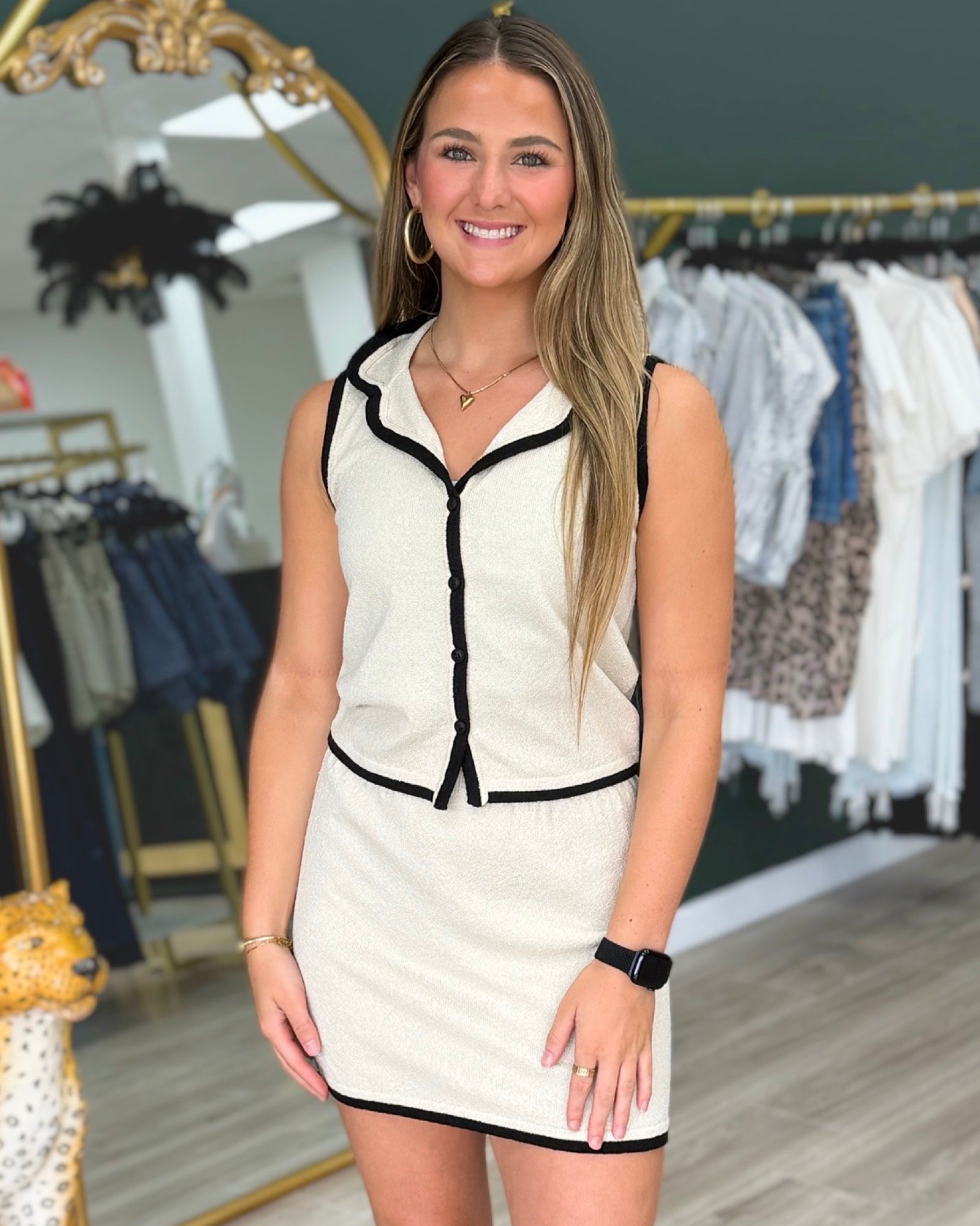 "Suit up in style with this Cream with Black Trim Sweater Vest and Skirt Set for Ladies. Keep cozy and chic with this matching set, perfect for any occasion. Don't miss out on this versatile and trendy addition to your wardrobe. (Fashion meets function with this must-have set!)"