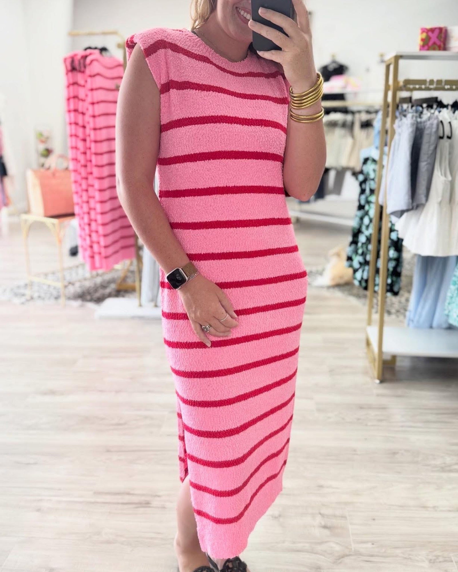 Pink/Red Shoulder Pad Textured Stripe Knit Dress