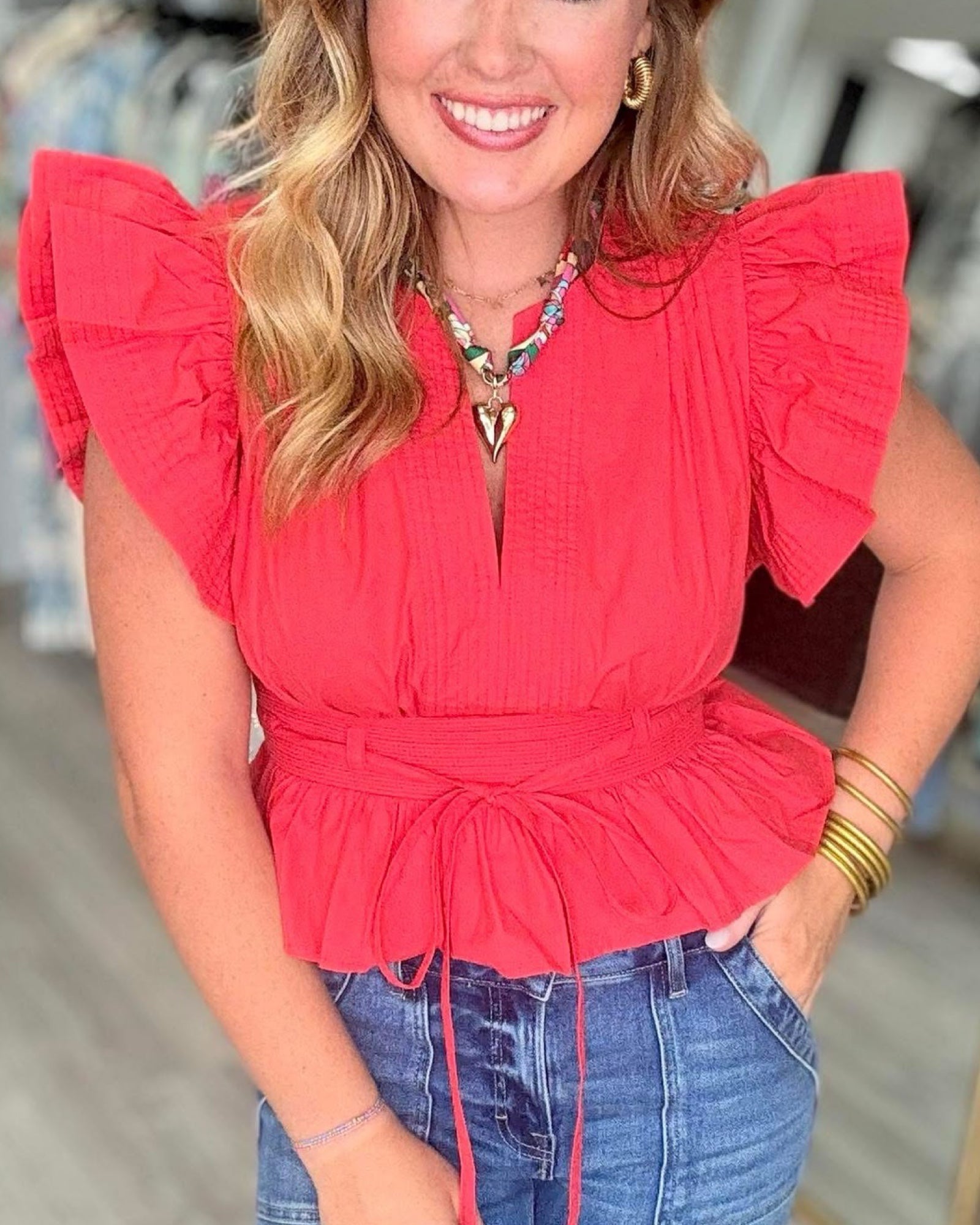 Get ready to flutter into style with our Red Flutter Sleeve Poplin Top! This ladies' top combines a classic poplin fabric with a playful twist, featuring flutter sleeves that add a touch of fun to any outfit. Perfect for any occasion, this top will have you looking cute and stylish all day long.